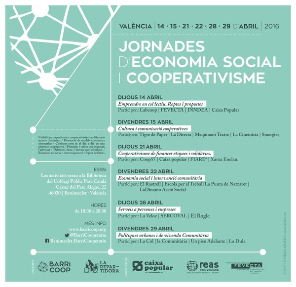 Durant el mes d’abril, tindrem sis sessions, amb la participació de més de 20 entitats de l’economia social i cooperativa, per mostrar i debatre al voltant de formes alternatives de fer economia i de promoure fórmules d’autoocupació cooperatives.